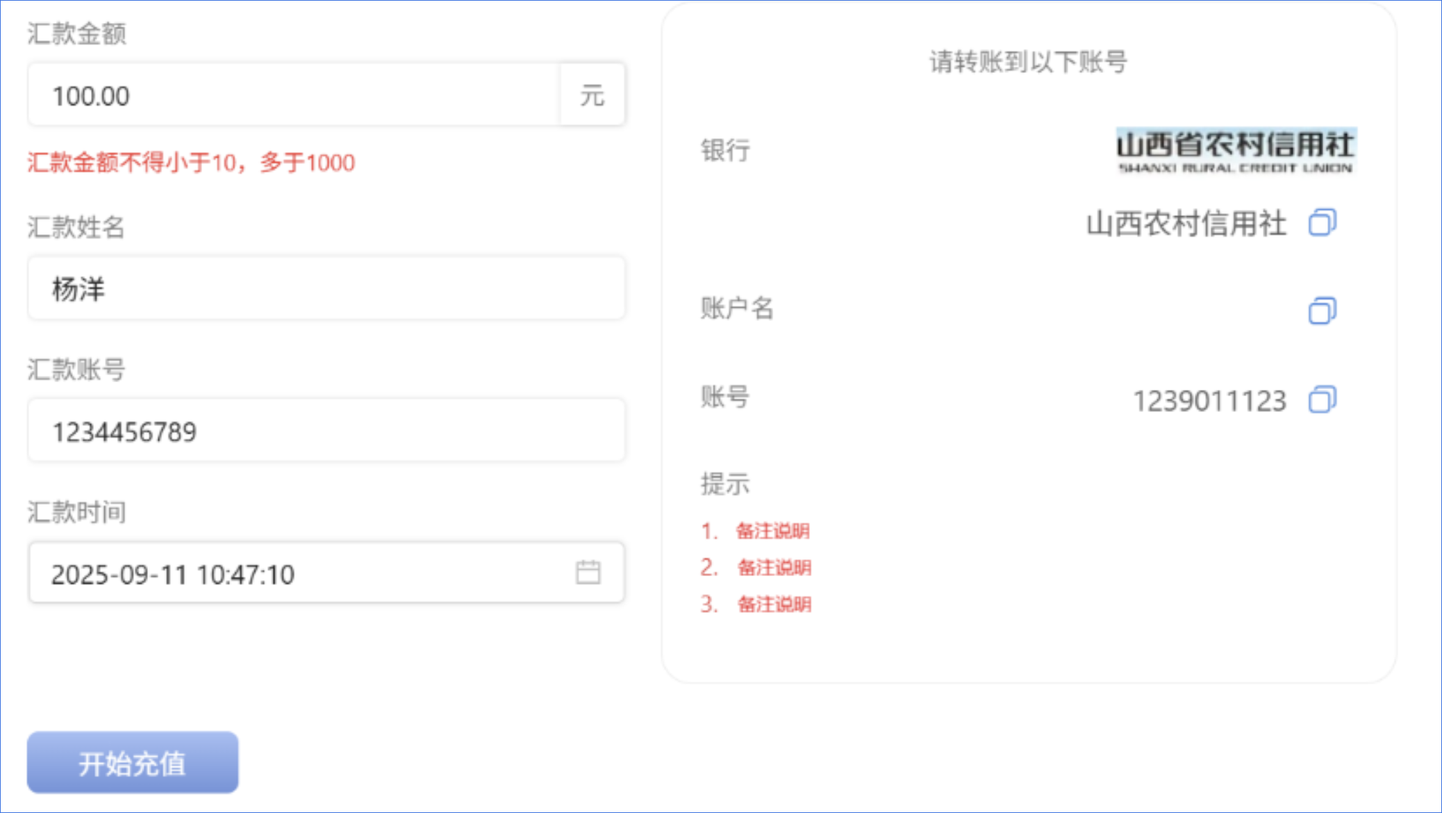 【温馨提示:实际付款金额务必与提交金额一致,请按照流程付款,并请勿保留旧的充值记录私自或重复转账,否则无法到账】